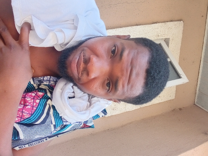 An adult male is depicted from the chest up, positioned centrally in the frame, looking directly into the camera. He has short black hair, a beard, and a mustache. He wears a white t-shirt, pulled down on his left shoulder, partially exposing his chest. A colorful patterned fabric, featuring blue, black, white, and pink designs, with the text "WAX EXCLUSIVE" visible, is draped over his left shoulder. A white rolled fabric is positioned beneath the patterned fabric on his left shoulder. His right hand is visible across his chest, with a gold-colored ring on a finger. The background consists of a textured light brown wall. A white-framed window or door opening with a dark interior is visible behind and to the left of the man's head, below a white horizontal ceiling or overhang structure. The scene is located in the city of Zango-ndaji, Nigeria.