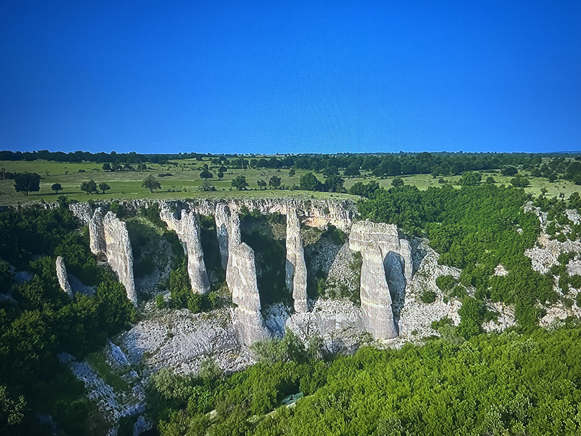 An aerial view depicts a natural geological formation situated near Oreshak, Bulgaria