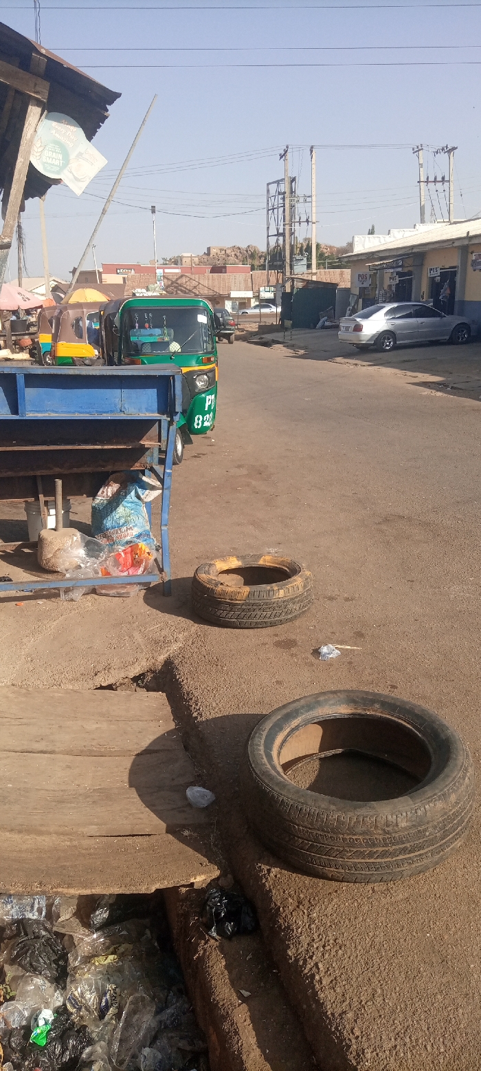 A street scene captures discarded tires on the roadside near overflowing trash