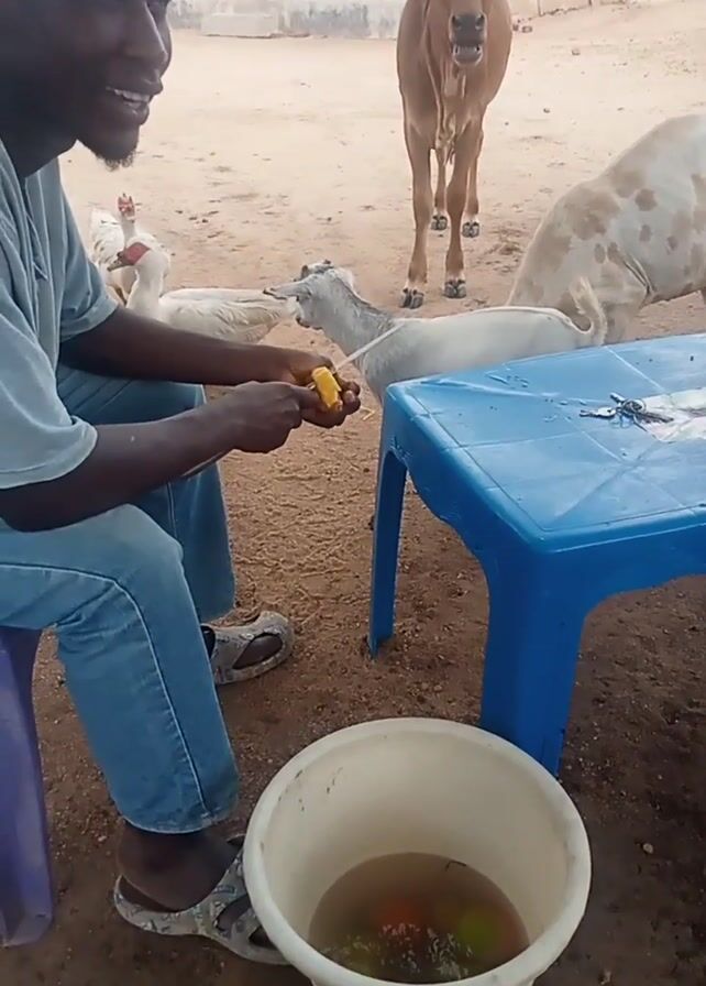 A man is sitting on a small blue plastic chair outdoors. In his hands, he’s using a knife to cut something yellow and orange. He then takes a bite. Next to him, there is a white bucket with water and what appears to be fruit floating in it. A small blue table is next to the bucket. Behind him, there are several animals, including a brown cow, a white goat, and a white chicken. The ground is sandy. There's a building visible in the background.