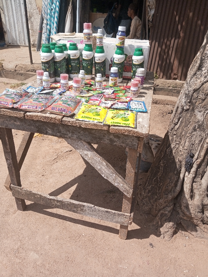 An outdoor vendor stall is visible on a dirt ground in Kawo, Nigeria. The central focus is a rustic wooden table displaying various agricultural products. On the table, numerous plastic bottles with green and white labels, some marked "GERTELA," are arranged, alongside smaller bottles with pink, purple, and white caps. Multiple colorful sachets and packets are spread across the table, some yellow packets clearly labeled "ZTRA INSECT," and others appearing to contain seeds or pesticides. Larger clear plastic bags, possibly containing seeds, are also present. To the right of the table, a large tree with deeply textured bark is partially visible. In the background, two individuals are partially discernible; one wears a light-colored garment, the other appears darker, standing near a building with a corrugated metal facade and a brown wall. Further left in the background, blue and white fabrics are draped. The ground is a light brown, arid dirt, and daylight illuminates the scene, casting shadows from the table and tree. No direct actions or interactions are clearly visible from the partially obscured individuals.
