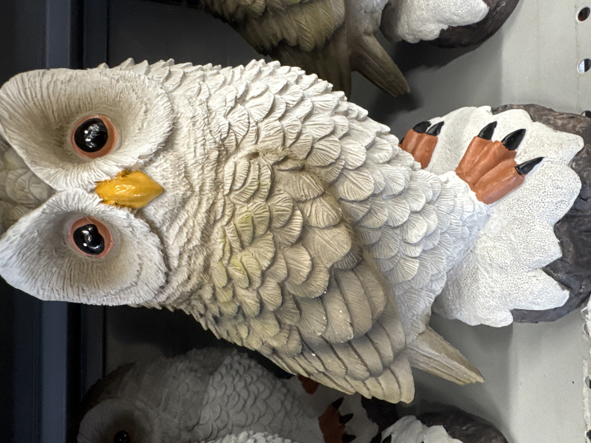 A close-up shot depicts two adjacent owl figurines made of painted concrete, likely displayed for sale indoors