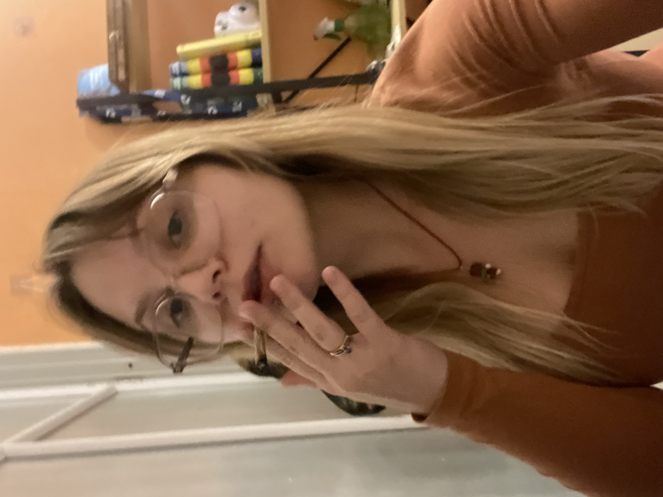 A woman with long blonde hair, wearing round glasses and an orange top, is holding a rolled cigarette with her fingers. She is also wearing a ring on her finger and a red necklace. In the background, there is a shelf with some objects on it. The image has a slight upward angle.