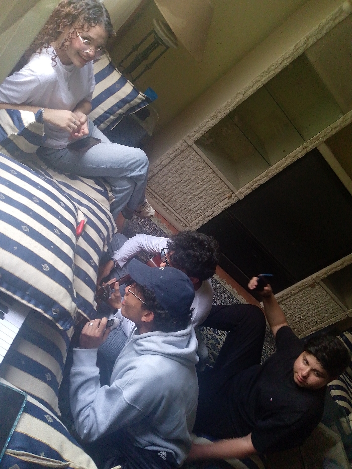 Four people gather in a room with striped cushions and ornate shelves. A woman with curly hair sits, smiling, on a large striped pillow. Below her, two men, one in a blue cap and the other with curly hair, appear to be playing musical instruments. A fourth person, in black clothing, reclines, holding a phone in their outstretched hand. The angle is slightly upward, capturing the scene from a low perspective.
