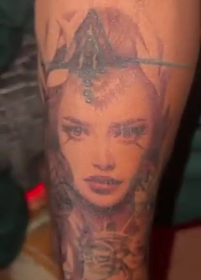 close-up of a person's forearm with a tattoo. The tattoo is of a woman's face with a triangular design above her head and other designs around her. Above the main tattoo is another tattoo of an eye. The person is wearing green pants and sitting on a surface with a patterned covering. The camera moves slightly to provide a better view of the tattoo.