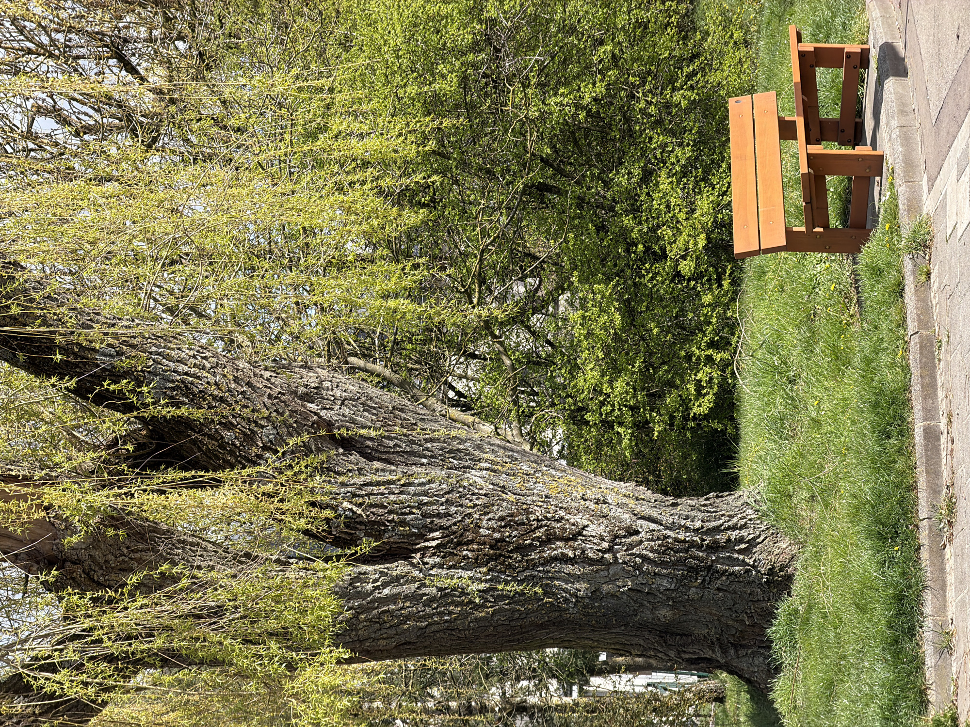 A ground-level, slightly angled photograph captures a wooden bench on a grassy area next to a sidewalk near a large, leaning tree in Esch-sur-Alzette, Luxembourg. The tree's trunk is thick and textured with gray bark, featuring sparse green shoots and branches emerging from it. Behind the tree, there is dense green foliage. The wooden bench, located on the right side of the frame, is simple in design and made of light-colored wood. The grass is green and moderately thick. The sidewalk is concrete and runs along the right edge of the frame. The picture is taken in daylight.