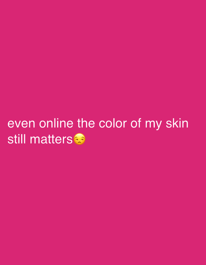 The scene, set within the city of Adankolo, Nigeria, is a static digital graphic. The background is a uniform hot pink (fuchsia) color. In the lower-central portion, white sans-serif text is displayed, reading: "even online the color of my skin still matters". A yellow sad face emoji, with downturned eyes and mouth, is positioned immediately after the word "matters". No people, physical objects, actions, or interactions are visually present. The environment is an abstract color field, devoid of geographical or contextual indicators beyond the specified location attribute.