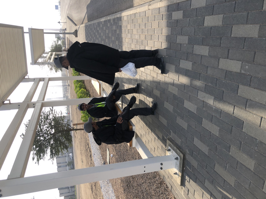 Three adult males are observed under a white metal shelter with a corrugated roof on a paved walkway in Hanak, Saudi Arabia, during daytime