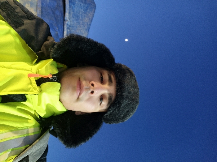 An image captured in Yukhta, Russia, displays a male subject in a close-up, chest-up portrait. The adult male, with short dark hair and a light complexion, faces the camera directly with a neutral expression. He wears a dark, fur-lined winter hat (ushanka style) with ear flaps lowered, and a neon yellow high-visibility jacket with an orange zipper pull and visible reflective striping on the right upper arm. The upper background features a clear, deep blue sky containing a prominent crescent moon in the upper-left quadrant. In the lower-left background, behind the subject's left shoulder, a partially obscured, possibly frosted or snow-covered structure or material draped with a blue tarp is visible.