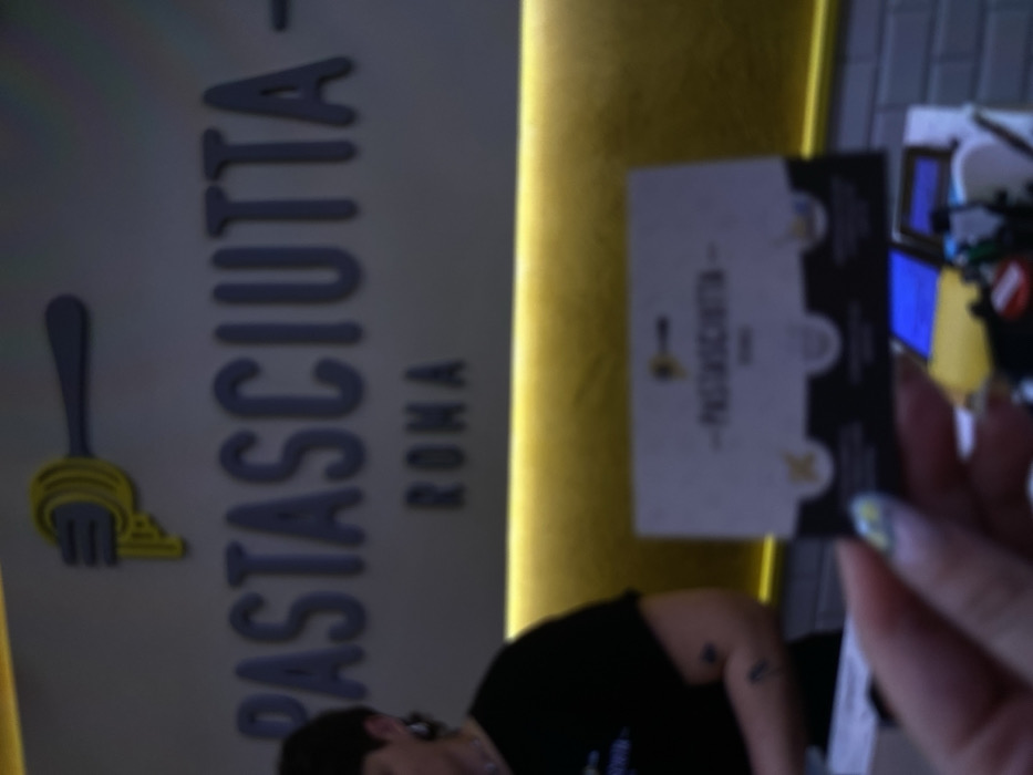 The image depicts the interior of a restaurant named "Pastasciutta" located in Rome, Italy. The main wall sign displays "PASTASCIUTTA" in large gray 3D lettering with "ROMA" directly below it, accompanied by a yellow fork and gray spoon logo. A person with short, dark hair, wearing a black t-shirt, earrings, and visible arm tattoos is partially visible on the left, standing behind a counter. The counter features a horizontal strip of bright yellow light. In the foreground, a hand with painted fingernails, decorated with yellow and blue elements, holds a rectangular business card. The card features the "Pastasciutta Roma" branding and logo. Blurry objects, possibly restaurant equipment including a device with a blue screen, are visible on the counter in the background. The lighting is generally dim.