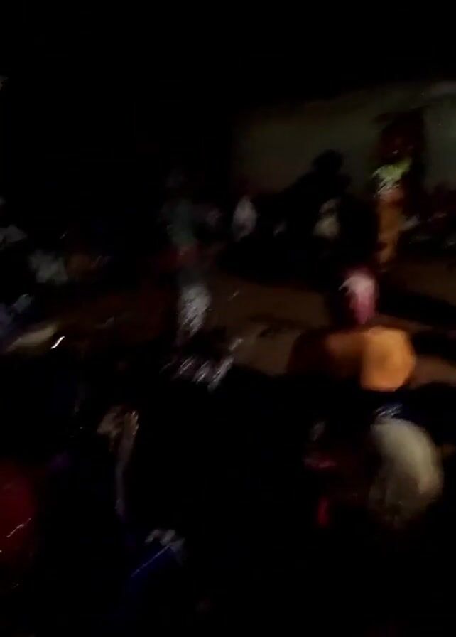 The video is shot at night, in a dimly lit outdoor setting with a group of people