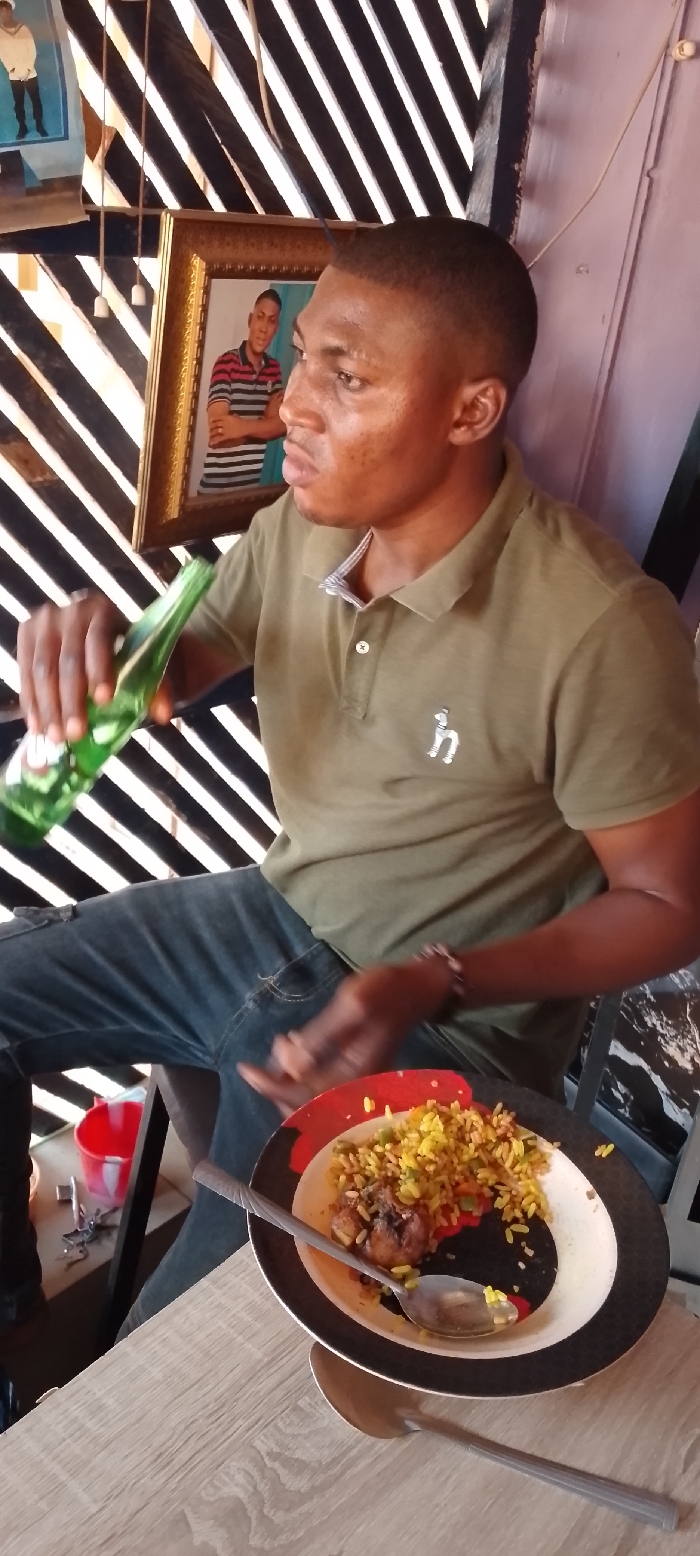 The image depicts an indoor scene in Sabon Tasha, Nigeria, featuring one male subject seated at a table. The man, with dark skin and a short haircut, is observed from the upper torso up, oriented in profile, looking towards the left side of the frame. He wears an olive-green short-sleeved polo shirt with a striped collar and a white embroidered figure on the left chest, paired with blue denim jeans. A beaded bracelet is present on his right wrist. He holds a green glass bottle in his left hand, positioned near his mouth, indicating consumption. His right hand rests near a plate on the light-colored wooden table. The table features a meal served on a round plate with a black rim, a red inner band, and a white center. The plate contains yellow rice mixed with green peas and other red components, alongside several pieces of cooked poultry, likely chicken. A silver spoon is partially submerged in the food on the plate. Another silver spoon, distinct in design with a textured handle, lies on the table surface next to the plate. The background consists of a wall or partition with alternating dark and light diagonal stripes. To the upper left, a gold-framed picture displaying a male individual in a striped shirt is visible. Further left and higher, a light blue object or framed item is partially visible. A red plastic bucket and several metallic items, possibly keys or tools, are visible on the floor in the lower left quadrant of the image. White cables or wires are vertically apparent against the striped background.