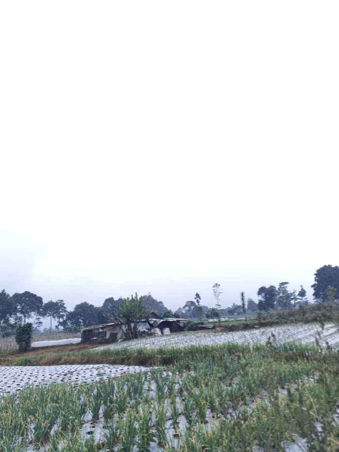 A rural landscape unfolds under a muted, overcast sky. The foreground features rows of crops, seemingly onions, cultivated on plastic-covered fields. Further back, a weathered structure, possibly a barn or farmhouse, is partially concealed by foliage. Trees dot the horizon, silhouetted against the pale sky, adding depth to the serene agricultural scene. A subtle powerline cuts through the distant trees.