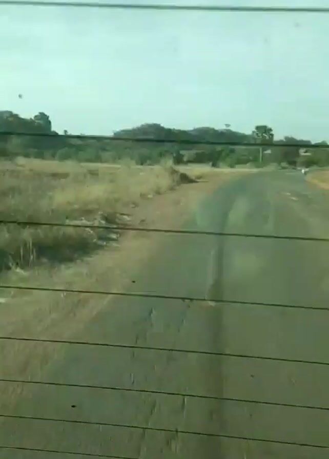 view through the back window of a vehicle moving along a paved road. The landscape outside the window consists of dry, grassy plains with scattered trees and rocky hills in the distance. The sky is overcast and light blue. The road is cracked and has some minor damage. The rear window of the vehicle has horizontal defroster lines. The vehicle appears to be traveling at a moderate speed.
