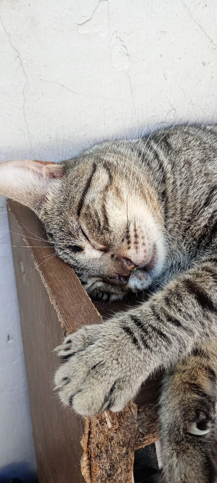 - "A tabby cat is deeply asleep on a wooden structure" by FM-kzA8r2, licensed under CC BY 4.0