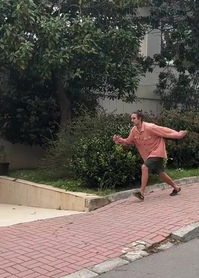 A man is running and jumping in an outdoor setting. He is wearing a pink shirt, green shorts, and dark shoes. He runs down a brick sidewalk and jumps over a low fence. He then uses his momentum to vault over a small stone wall next to a building with a gray door and a metal railing. The surrounding environment includes trees, bushes, and buildings. The weather appears to be overcast.