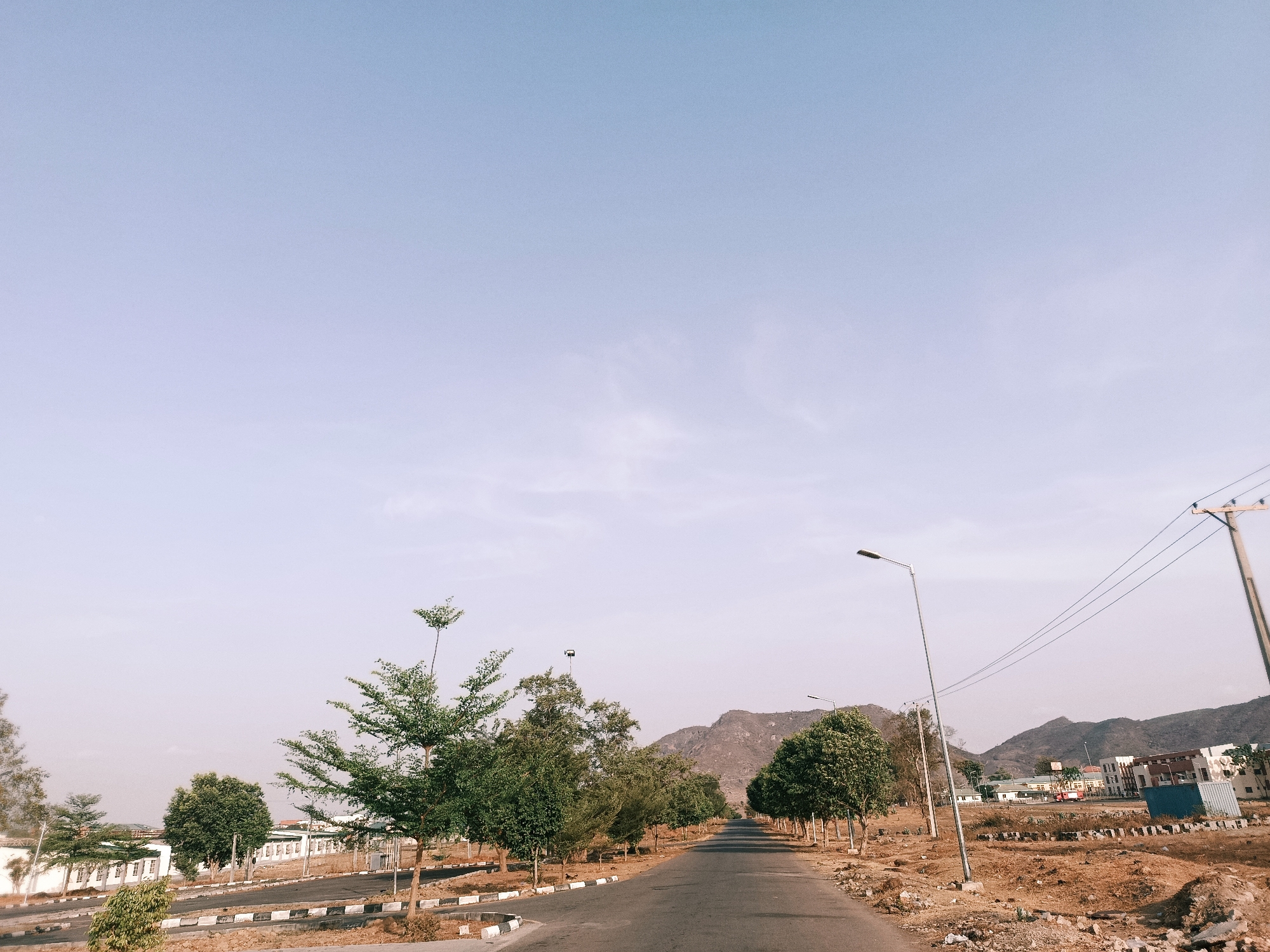 The image depicts a road in Rafin Pa, Nigeria. The road is paved and stretches into the distance, lined with trees on either side. A mountain range is visible in the background under a clear sky. Buildings are seen in the background. Utility poles and street lights are present along the side of the road. The area around the road appears to be undeveloped or under construction, with dirt and sparse vegetation. There are no people visible in the image.
