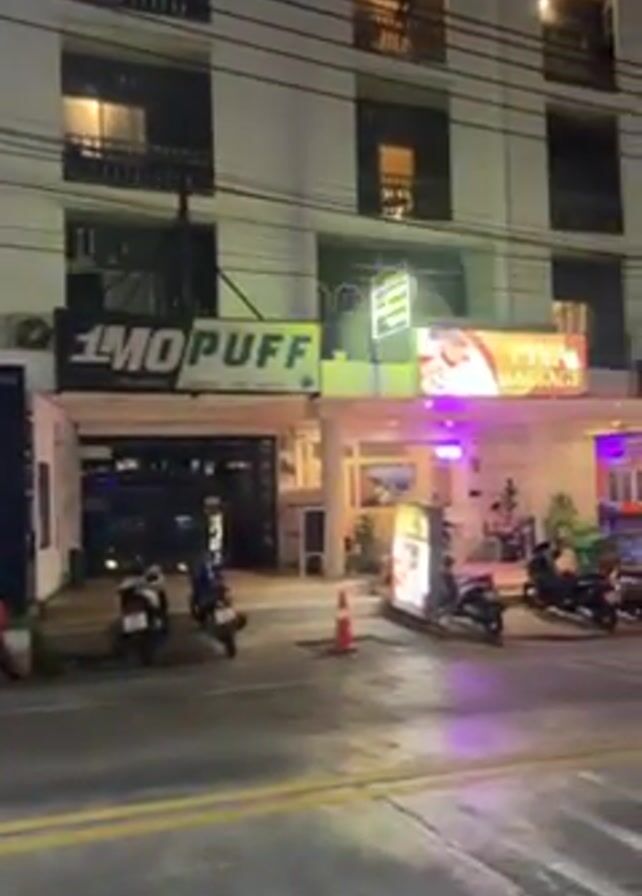 street scene at night. A white building with several stories is on the left, with business signage for "1MO PUFF" and other establishments. Cars and motorcycles are driving and parked on the street. Some people are visible sitting at tables in front of a business. The street is marked with pedestrian crosswalk lines. Street lights and the lights from the businesses illuminate the area.