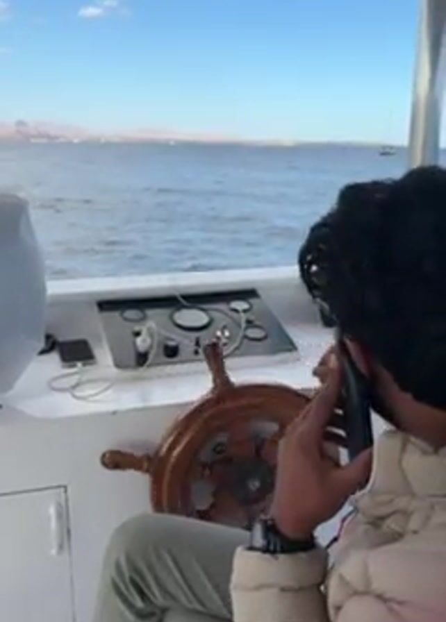 man sitting at the helm of a boat, engaged in a phone call. He is turned away from the camera, but his curly dark hair and light-colored puffer jacket are visible. The helm features a large wooden steering wheel and various instruments on a control panel. Through the boat's window, the view encompasses the open sea under a blue sky with scattered clouds, and a distant coastline or landmass. A security camera is mounted on the ceiling above the helm. The boat appears to be in motion.