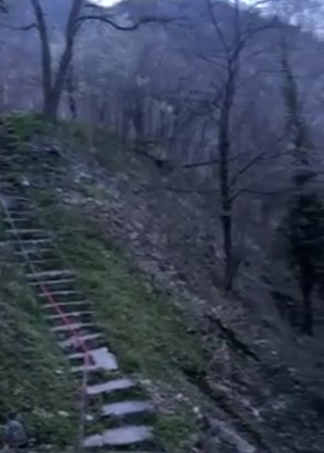 landscape with stone steps leading up a hill covered in grass and trees. A white railing runs along the steps. The video pans to the right, revealing a stream running through the woods. The trees are bare, and the overall tone is slightly overcast.