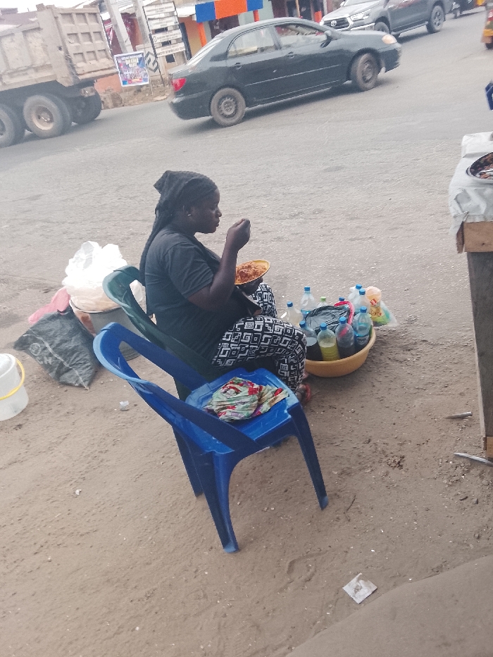 A woman wearing a headscarf sits on a green plastic chair beside a blue one with a folded cloth. She eats from a plate, a basin of water bottles near her. A gray truck and black car drive on a nearby road. There's a white container and black bag visible, as well as an unfinished wooden table. The ground around her is a mix of dirt and pavement.