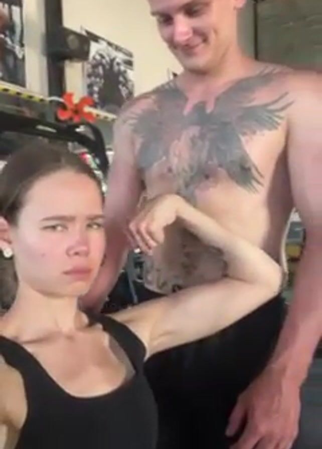 A young woman and a shirtless man stand close together in a gym. The woman, wearing a black tank top, flexes her arm to show her bicep, while the man, who is taller and has several large tattoos on his chest and abdomen, flexes his bicep as well. They look at each other and smile. The background includes gym equipment and posters.