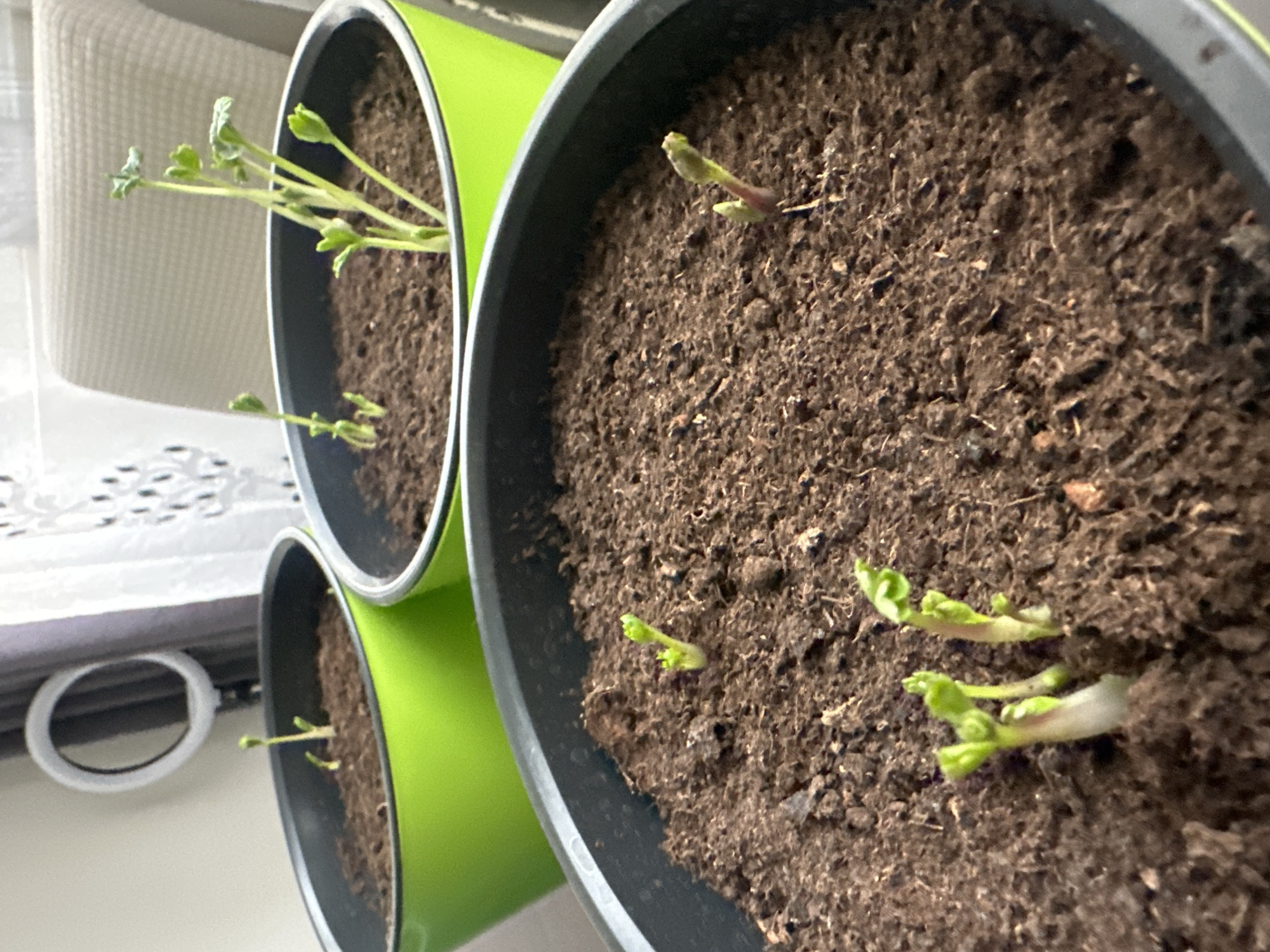 The image depicts an indoor scene featuring three plant pots containing dark brown soil and various stages of green sprouts