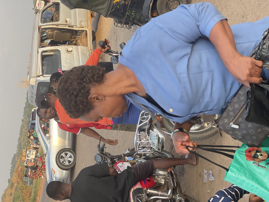 A woman in a blue collared shirt holds bags. She stands beside a motorcycle, a silver car, and a white passenger van. People stand nearby, some in red and orange shirts. A man in a black shirt sits on the motorcycle. The motorcycle’s license plate reads "UNK 1520." The scene appears to be on a street with other vehicles and people visible in the background.