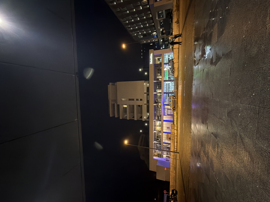 At night, a partially lit street showcases buildings. "Deloitte" is visible atop one building, next to a medical office. A modern, multi-story structure with open spaces stands nearby. Streetlights illuminate the wet pavement, creating reflections. Two figures stand on the sidewalk. A tall building is partially visible in the background, while a dark structure looms on the left.
