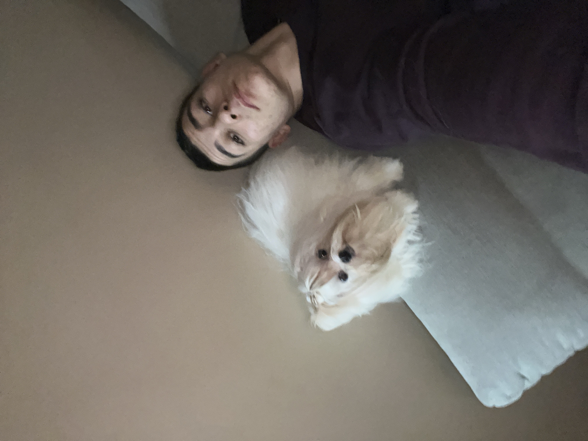 - "man and a small white dog, possibly a Pomeranian, lying on a light brown surface, likely a bed or couch" by FM-HySMk1, licensed under CC BY 4.0