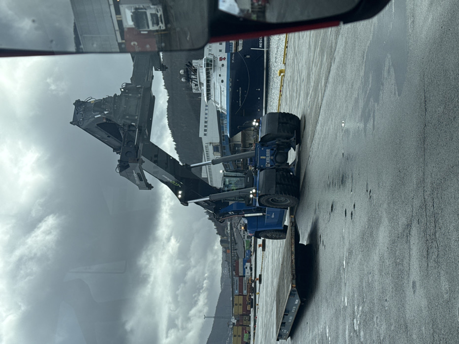 The image depicts a commercial port scene in Bergen, Norway, under an overcast sky. In the mid-ground, a large blue Kalmar container handler, bearing the text "KRLMÅR," is positioned on a wet asphalt surface. Its telescopic boom is extended upwards and forward, with several LED lights illuminated on the boom and cabin. To the immediate left of the container handler, a dark-colored flatbed container chassis or flat rack rests on the wet ground. In the background, a dark blue and white offshore support vessel, identified by the names "NORTH POMOR" and "RESCUE" on its hull, is docked at a pier. Behind this vessel are several white industrial buildings. Further to the left in the background, multiple stacks of shipping containers, including some marked with the "MAERSK" logo, are visible, indicative of a container terminal. Beyond the industrial structures and containers, vegetated mountains rise under a heavy, grey cloud cover. The foreground asphalt is visibly wet with scattered puddles and reflections. A portion of a red-framed vehicle side mirror and reflections from inside a vehicle are visible along the right edge of the frame, indicating the photograph was taken from inside a vehicle. No individuals are discernible.
