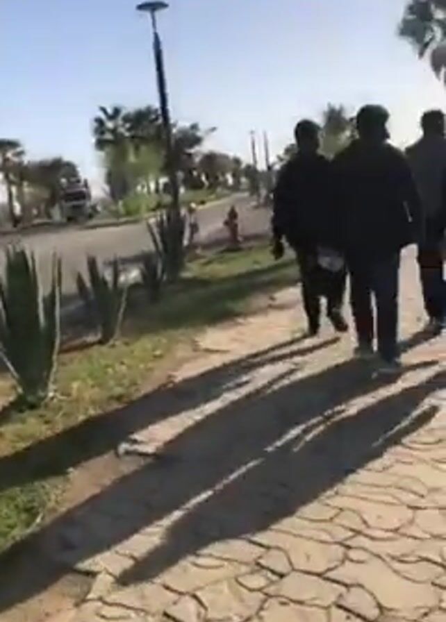 A group of five men walks away from the camera on a paved path. The path has a tessellated, irregular pattern in light shades. A road borders the path, and there are palm trees and other plants along the roadside. The sky is blue and the light is bright. The men are wearing dark clothing except for one wearing light pants. Their shadows are long, suggesting it is early morning or late afternoon. There is a red fire hydrant visible by the road.