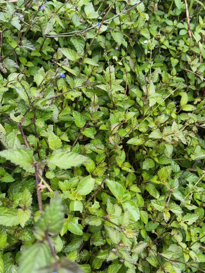 Lush green foliage dominates the scene, showcasing a dense ground cover of small, ovate leaves. Many leaves exhibit minor imperfections and slight discoloration, adding to the natural texture. Dark reddish-brown stems weave throughout the plant mass. Tiny blue and white flowers are scattered sparsely, providing subtle color accents. The overall impression is one of verdant abundance, despite the small imperfections visible in some of the leaves.
