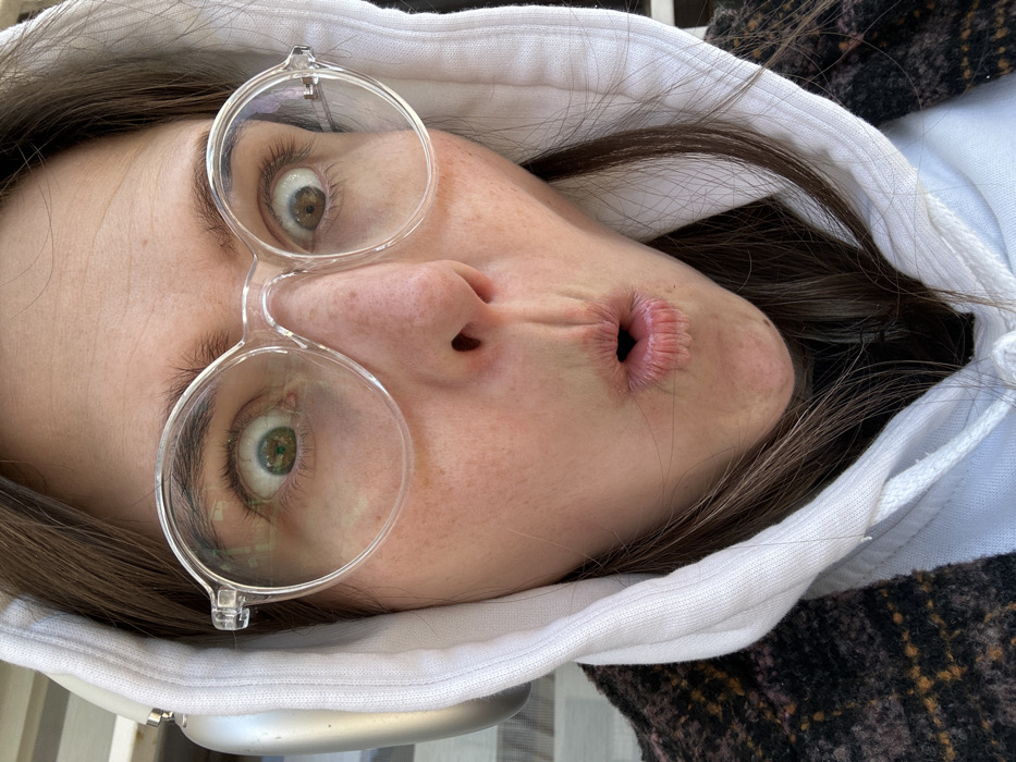 A close-up, vertical photograph depicts an individual with light brown hair and fair skin, centered in the frame