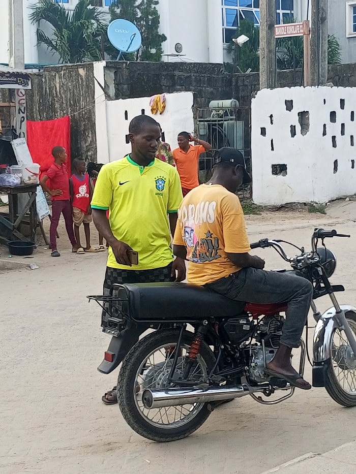 An outdoor daytime scene depicts a street in Ado, Nigeria, specifically near a street sign reading "BANKOLE KOWOLAFE CL." In the foreground, an adult male with closely cut hair stands facing right, wearing a yellow Nike "Brazil" football jersey, black patterned shorts, and brown sandals, holding a smartphone in his right hand. To his right, an adult male wearing a black baseball cap, an orange graphic t-shirt (featuring cartoon characters and text, possibly "NARCOS"), dark jeans, and dark flip-flops is seated on a red motorcycle. The motorcycle has a black seat, a chrome exhaust pipe, spoked wheels, and a rear luggage rack. This individual is facing away from the camera, looking downwards. In the midground, to the left, two young boys are visible: one in a red long-sleeved shirt and purple pants, and another in a red t-shirt with a white basketball graphic and light shorts. They stand near a wooden stall with a black basin on the ground beside it and a red fabric hanging behind it. Further back on the right, another adult male in an orange polo shirt is partially visible, with his left hand near his head. The background features a low, dark-colored wall transitioning to a white wall with irregular dark openings. Behind this wall, a grey-green transformer box is visible. In the far background, a multi-story building with blue-tinted windows and a blue DSTV satellite dish on its roof is present, flanked by green foliage. The ground is an unpaved dirt or gravel surface.