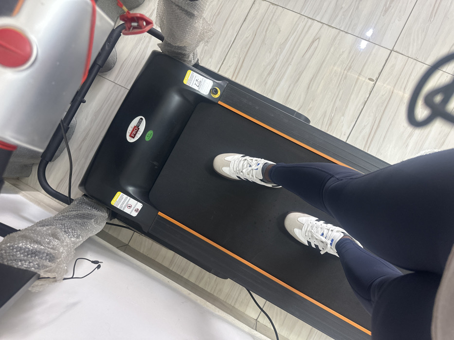 This image depicts an indoor scene within Karum, Nigeria, viewed from an overhead perspective. The primary subject is an individual's lower body, positioned on a black "PRO TECH" brand treadmill. The person is wearing dark blue athletic leggings and white athletic shoes with light brown accents and dark blue stripes. The treadmill's running belt features orange side stripes, and its control panel displays the "PRO TECH" logo, a green "QC PASSED" sticker, and multiple yellow-backed warning labels. A red safety clip is attached to a red cord extending from the treadmill's front console. Portions of the treadmill's handlebars are visible, covered in clear bubble wrap. A black electrical cord extends from the treadmill towards a plain white wall on the left side of the frame, near which a small black audio jack or similar connector is present. The floor is covered with light-colored, veined rectangular tiles. A silver-colored object, possibly another piece of exercise equipment, is partially visible in the upper right background.
