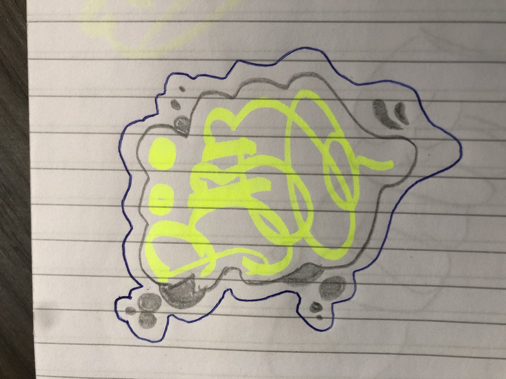 The image displays a static, hand-drawn graffiti-style design on white, vertically lined notebook paper. The central subject is an irregular, cloud-like form delineated by a dark blue marker outline. This form is shaded with light gray pencil, exhibiting several darker gray, irregular splotches. Superimposed within this shaded area is a vibrant neon yellow curvilinear design, possibly stylized text or a tag. The paper rests on an indeterminate dark, textured surface. This image represents a drawing on paper, not a real-world scene or specific location in Casablanca, Morocco. No people, active subjects, or direct interactions are present.