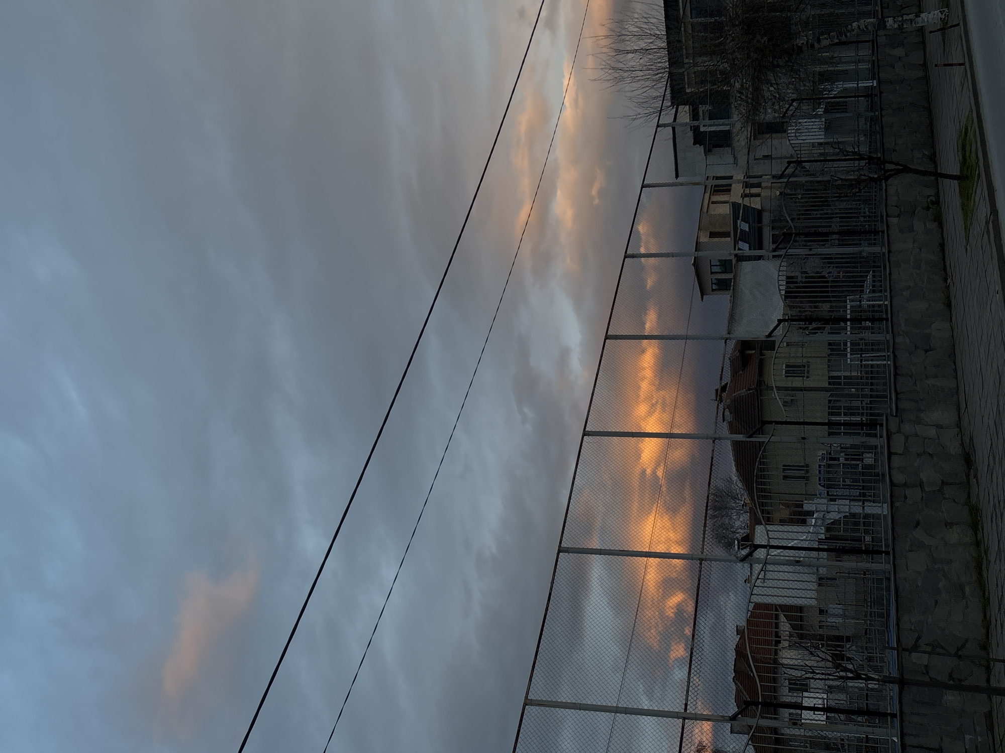 The image, rotated 90 degrees counter-clockwise, shows a view of a street scene in Goce Delchev, Bulgaria, at dusk or dawn. The sky is predominantly gray and cloudy, with patches of orange light visible between the clouds. In the foreground, a chain-link fence runs parallel to the frame, partially obscuring the view of buildings and houses on the other side. Behind the fence, there are trees with bare branches. Electrical wires are visible diagonally across the sky. A narrow sidewalk runs along the right side of the frame, next to a low stone wall.