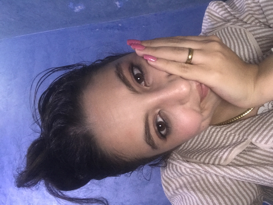 An image depicts a close-up portrait of a young adult female looking directly at the camera. Her dark hair is styled in a high, messy bun or topknot. She has dark eyes, defined eyebrows, and appears to be wearing eyeliner. Her complexion is light-to-medium, with subtle blush on her cheeks. She wears a light-colored, vertically striped top, and a glimpse of a white lace garment is visible beneath. A thin gold-colored chain necklace is visible around her neck. Her right hand is raised, with fingers partially covering her mouth and chin. The fingernails on her visible fingers are painted a bright pink color and appear to be elongated. A plain gold-colored band ring is present on her right ring finger. The background is a solid, medium-blue wall with some visible texture and lighter, worn patches. The specific location within Ouislane, Morocco, cannot be determined from the visual evidence.