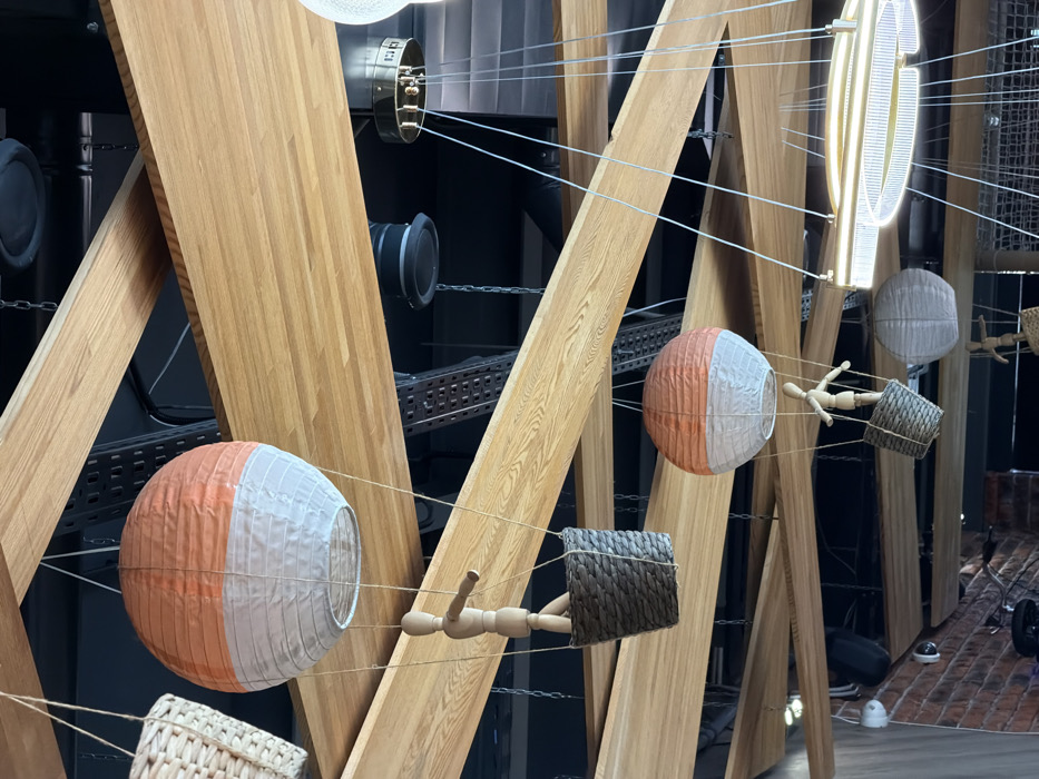 This image depicts a decorative interior ceiling within a commercial establishment in Naberezhnye Chelny, Russia. The ceiling is characterized by a series of intersecting light-colored wooden beams set against a dark background, revealing exposed industrial elements such as dark ducts and metal structures. Suspended from the ceiling are multiple spherical paper lanterns designed to resemble hot air balloons. The most prominent lantern, located in the upper left, features an orange upper half and a white lower half. Directly below it, a light-toned wooden articulated mannequin stands within a grey, woven basket, tethered to the lantern by thin strings, mimicking a balloonist in a gondola. A second similar orange and white lantern, also accompanied by a wooden mannequin in a woven basket, is positioned further right and lower in the frame. Additional monochrome white or light grey spherical lanterns are visible throughout the ceiling, some with accompanying baskets and mannequins. Lighting fixtures include a modern, elongated circular chandelier with multiple luminous rings, along with various recessed lights and industrial-style chain-suspended fixtures. In the lower left quadrant, a section of a reddish-brown brick wall is visible, featuring a white dome-shaped security camera mounted upon it.