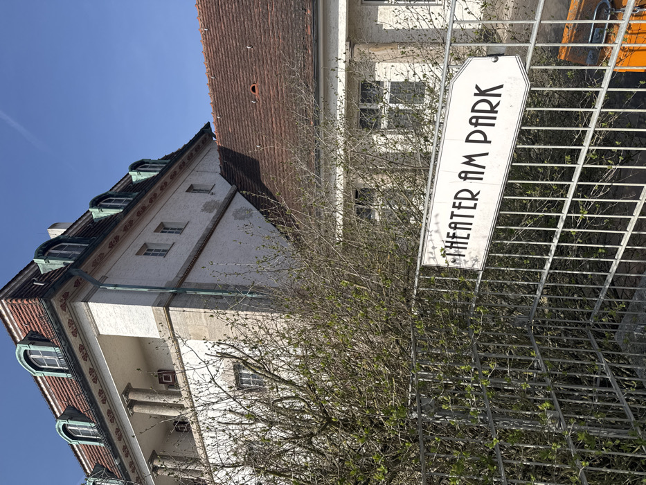 The image displays an exterior view of a building identified as "Theater am Park" in Bad Nauheim, Germany, under a clear blue sky
