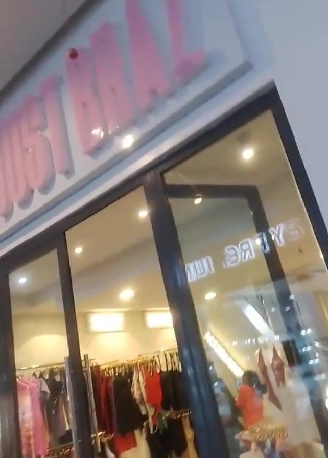 The video begins with an upward angled shot of the exterior of a shopping mall store