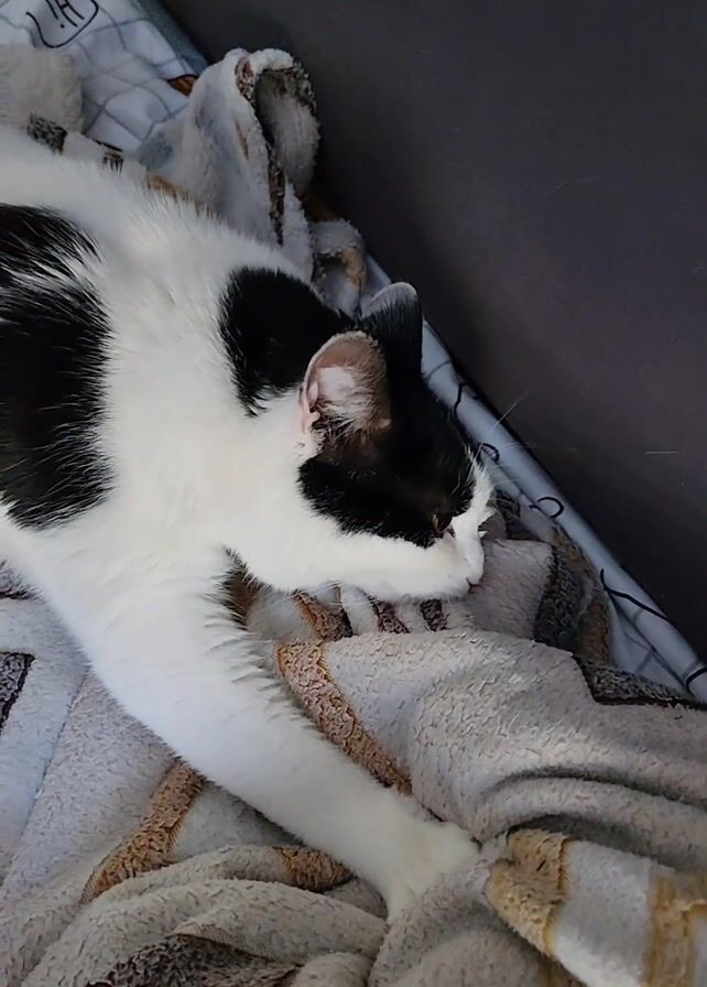 A black and white cat lies on its side atop a blanket. The blanket has various patterns. The cat uses its front paw to grab at the blanket. A grey wall is in the background.