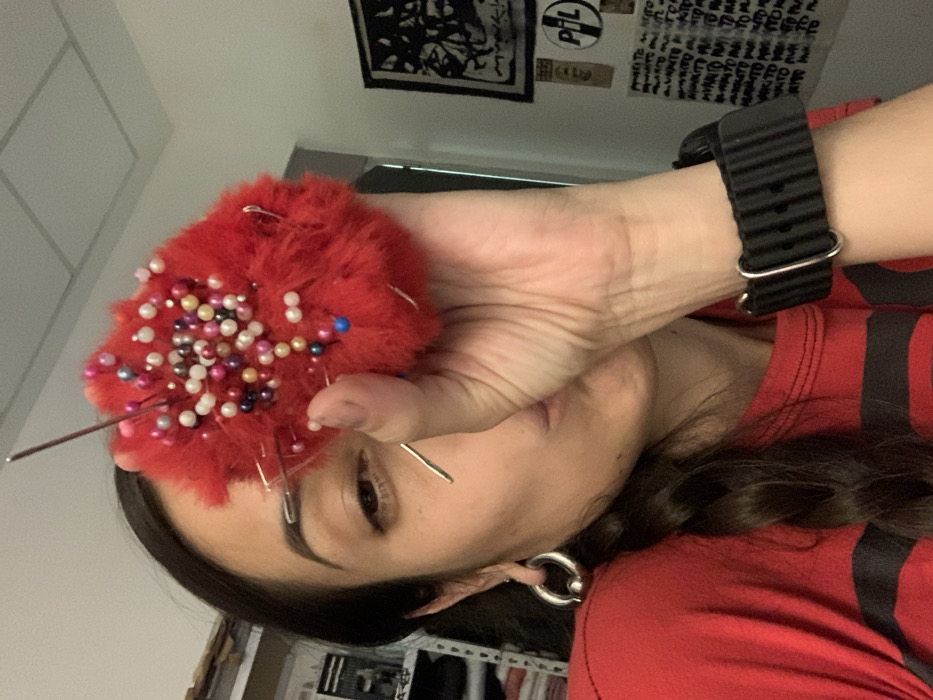 - "A person holds a red, furry pincushion filled with colorful pins in their hand" by FM-JzHNd2, licensed under CC BY 4.0