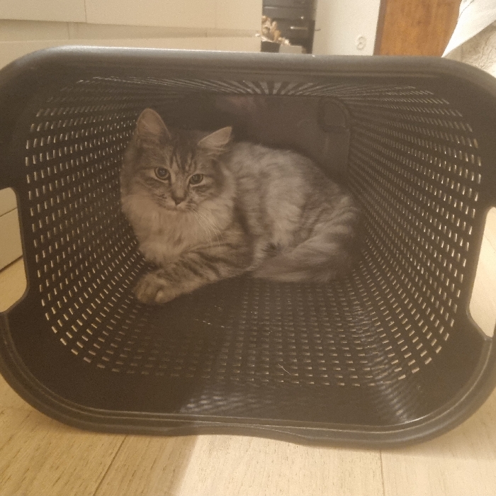 - "A long-haired silver tabby cat is observed lying within a black, rectangular, perforated plastic laundry basket" by FM-YTYDR2, licensed under CC BY 4.0