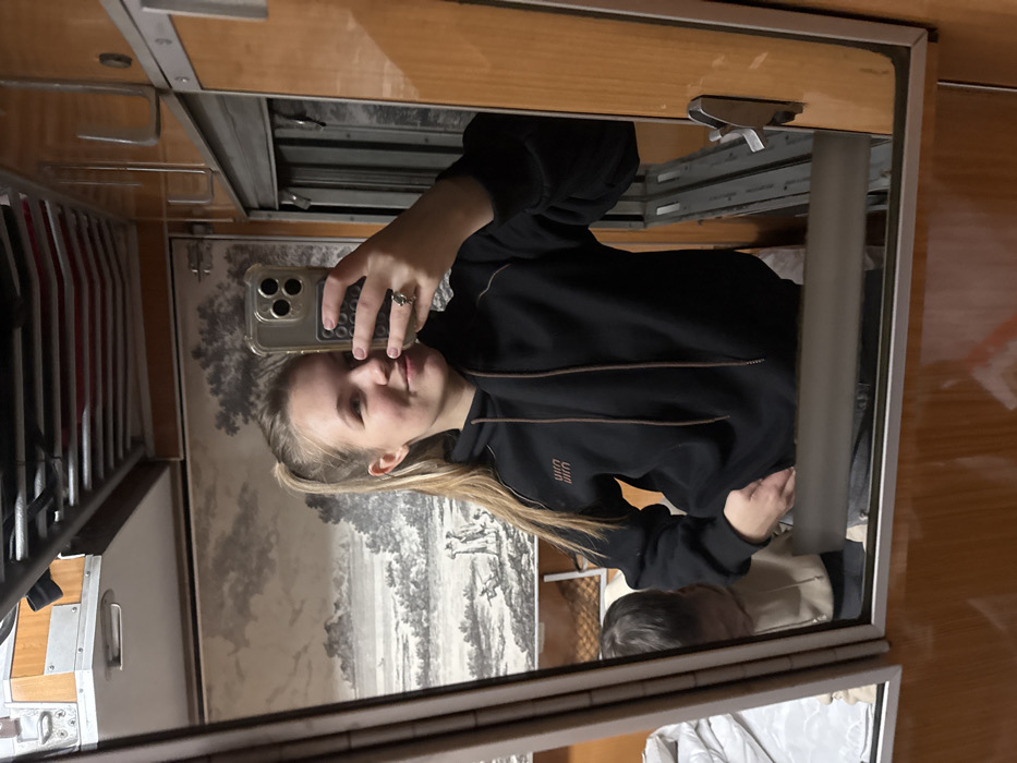 A mirror selfie shows a woman holding a phone with multiple lenses, revealing a reflection of a patterned wallpaper backdrop and an open wardrobe. She wears a black jacket with a small design on the left breast. The lower part of another person's face is visible in the reflection. The surrounding frame includes wooden panels and metallic hardware.
