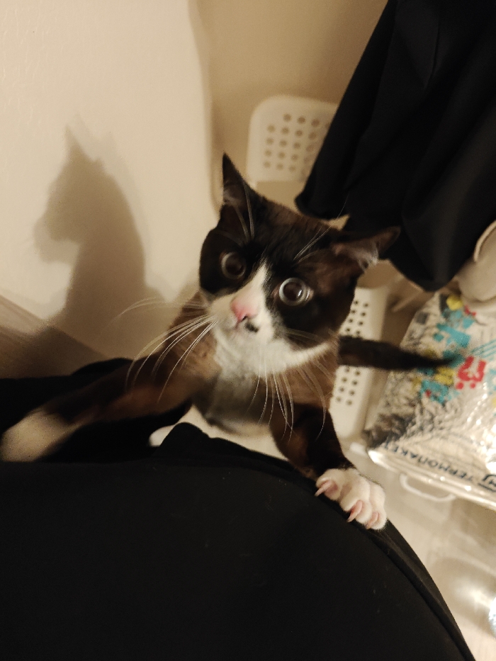 - "A brown and white cat with big eyes is clinging to a person wearing black clothing" by FM-eMutn2, licensed under CC BY 4.0