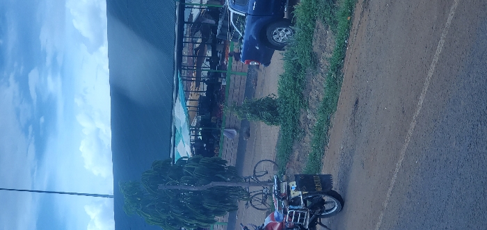 This image depicts an outdoor market scene in Mua ward, Kenya, under a partially cloudy sky. In the foreground, a paved road with a faded white centerline runs horizontally across the lower third. On the far left, a red and black motorcycle with a visible rear rack and a mudguard displaying partial text is parked. A strip of grassy terrain separates the road from the market. On this strip, a tree with green foliage stands, with a dark-framed bicycle leaning against its trunk. A smaller, conical green bush is also present. To the right, the rear section of a dark blue pickup truck with chrome wheels is parked on the grassy area. In the background, a large open-air market structure is visible. It features a dark roof, partially covered by a lighter, possibly green and white striped canopy, supported by green-painted framework. Beneath the canopy, various stalls display indistinct merchandise, and multiple figures of people are discernible within the market space. One individual is partially visible near the rear of the blue pickup truck. A tall, thin pole or antenna extends vertically into the sky on the far left.