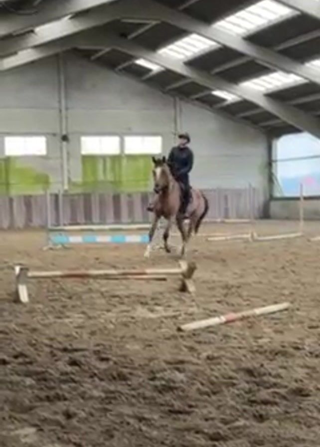 person riding a horse in an indoor arena. The rider is wearing a helmet and dark jacket, and the horse is a light brown color. They are trotting and go over a very low jump. The arena has a dirt floor and several rails laid down. The arena is lit by natural light coming through windows in the walls and roof. There is some equipment visible, including several jumps.