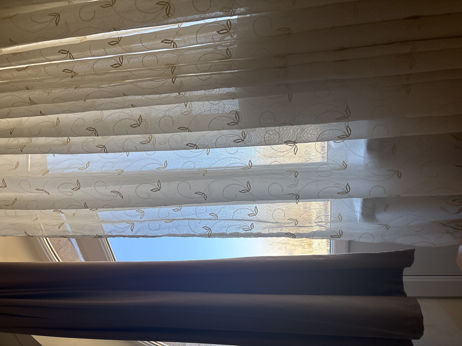 A layered view through curtains. Semi-transparent curtains with a delicate leaf pattern filter light, revealing glimpses of blue sky and building exteriors. A heavier, brown curtain lies bunched at the bottom, obscuring the view further. The overall scene is softly lit, casting shadows and creating a sense of depth through the varying textures and opacities of the fabrics.